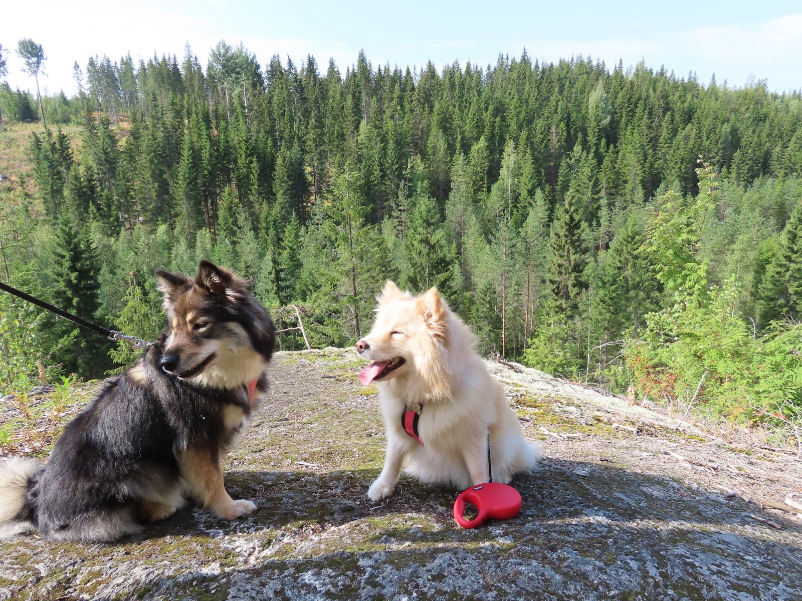 Pörö-peikon polku on vain reilun kolmen kilometrin rutistus, mutta koska korkeuserot ovat huimat, se on ihan kunnon pinnistys. Välillä noustaa korkeuksiin ja sitten taas laskeudutaan alamäkeen, eikä kyse oli mistään loivista pikkunyppylöistä. Nyt kun narun etupäässä touhotti terhakka nelijalkainen, meinasi meillä ihmisillä tulla hätä käteen. Kahdella jalalla ja tässä iässä ei enää mennä vuorikauriin notkeudella. Aika hyvin nämä ystäväisemme sitten hoksasivat, että välillä on hitaampia odotettava.