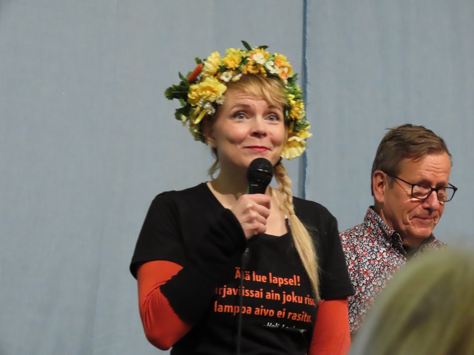 Kupu kylläisenä jäimme tutkailemaan myyntipöytien tarjontaa niin, että miltei missasin kokonaan Timo Parvelan haastattelun. Kerkesin kuulla vain viimeiset viisi minuuttia. Mutta siinä meillä on mies, joka on todellakin tehnyt voitavansa suomalaisten lasten lukuinnon herättämiseksi!
