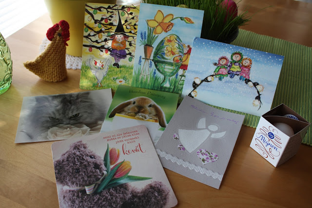 Välillä hypistelin pääsiäispostia. Kiitos lähettäjille, jotka jaksavat muistaa! Olipa postilaatikkoomme ilmestynyt omatekoisen kortin kaverina jopa perinteinen herkku eli Mignon-munakin!