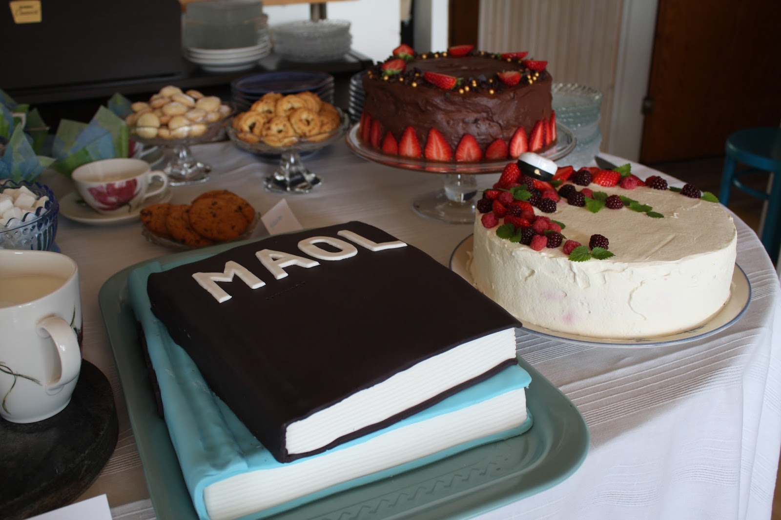Suolaisten syömisten jälkeen juhlakansa sai maistellakseen makeita kakkuja ja rapeita pikkuleipiä. Kuopus itse ahkeroi pikkuruisia vaniljakakkusia vieraille makupaloiksi ja blogiystäväni ja satunnainen työkaverini Kirjastokuningatar kantoi kortensa kekoon leipomalla meille runsaan määrän herkullisia rinkelipikkuleipiä. Kuten jo edellisessä postauksessa raportoin, kuopuksen kummitäti ahkeroi ja teki suuritöisen sokerimassakuorrutteisen kirjakakun. Itse leivon gluteenittoman mansikka- ja banaanimoussea sisältävän suklaakuorrutteisen täytekakun sekä toisen gluteenittoman kakun, jonka täytteeseen tuli vadelmahilloa, vadelmia ja valkosuklaamoussea.
