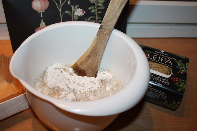 Miten lie kesä menikään ja syksykin jo melkein, ennen kuin tuli aika leipoa aineksista leipä. Eilen se päivä vihdoin koitti! Tyhjensin leipäainespussin kulhoon ja lisäsin perään kolme desiä reilusti kädenlämpöistä vettä.