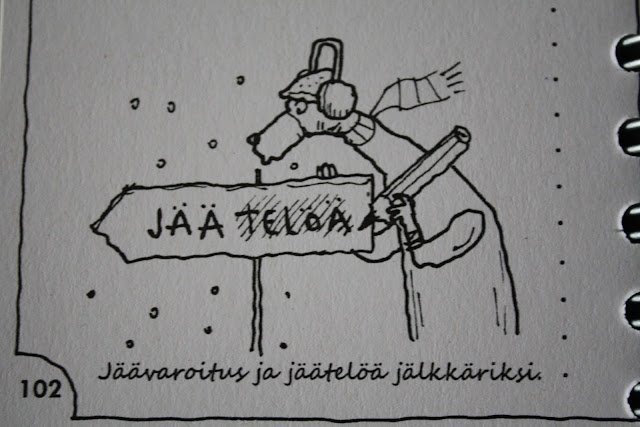 Kalenterin jokaisen viikon aukeamalla on toisella sivulla lisää kirjoitustilaa ja joku hupaisa ja/tai viisas oivallus. Ensi vuonna tällä viikolla kalenteri on hyvinkin tämän vuotisissa tunnelmissa, hauskaa! Vaikkei ulkona vallitseva jäätikkäinen keli kyllä nauratakaan oikeasti.