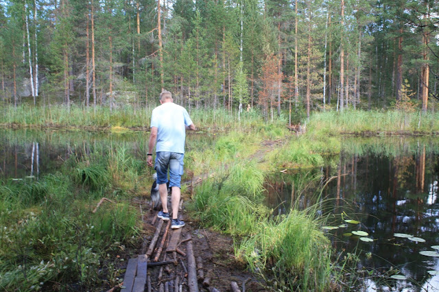 Takaisin autolle palasimme tietenkin omia jälkiämme ja ylitimme uudelleen hyllyvän sillan. On se onni, että joku ystävällinen sielu on edes nuo pyöreät ja erikokoiset puut polun päälle asetellut. Muuten olisi ollut lammen ylitys ihan tekemätön paikka!