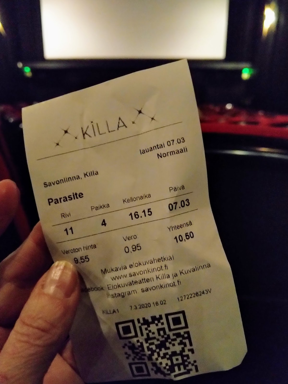 Punkaharjulta kotiuduttuamme tein meille lounasta, perunamuusia ja lihapullia. Sitten jaksoikin taas mennä... Nyt kävelin elokuvateatteri Killaan katsomaan monta Oscaria voittanutta Parasite-elokuvaa. Ulkoilusää oli edelleen mainio.